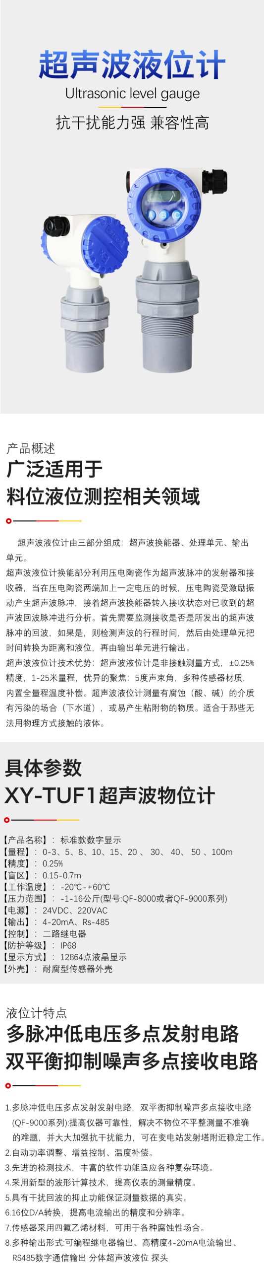 XY-GA鑄鋁型超聲波物(液)位儀,是我司根據(jù)多年應(yīng)用經(jīng)驗(yàn)開(kāi)發(fā)、制造的通用型超聲波物位計(jì)。它博采眾長(zhǎng),吸取了國(guó)內(nèi)外多種物位儀優(yōu)點(diǎn)。實(shí)現(xiàn)了全數(shù)字化、人性化設(shè)計(jì)理念, 成為我司升級(jí)換代的高端產(chǎn)品。外殼采用鑄鋁防水外殼、采用國(guó)際通用的電器接口。標(biāo)準(zhǔn)的接線端子,便于施工安裝;透明觀察窗口,更方便的物位數(shù)據(jù)觀察。具有完善的物/液位測(cè)控、數(shù)據(jù)傳輸和人機(jī)交流功能。主芯片采用進(jìn)口工業(yè)級(jí)單片機(jī)、數(shù)字溫度補(bǔ)償和超寬電壓輸入穩(wěn)壓等數(shù)十塊相關(guān)專用集成電路。具有抗干擾性強(qiáng)、可任意設(shè)置上下限節(jié)點(diǎn)、在線輸出調(diào)節(jié)、帶有現(xiàn)場(chǎng)顯示??蛇x擇模擬量,開(kāi)關(guān)量及RS485輸出,方便的與相關(guān)設(shè)施接口。它具有高可靠。無(wú)污染。性能穩(wěn)定。不必接觸工業(yè)介質(zhì)就能滿足大部分液位、料位測(cè)量要求。徹底解決了壓力式、電容式、浮子式等傳統(tǒng)測(cè)量方式帶來(lái)的纏繞、堵塞、泄露、介質(zhì)腐蝕、維護(hù)不便等缺點(diǎn)。因此可廣泛應(yīng)用于與料位,液位測(cè)控相關(guān)的各個(gè)領(lǐng)域。本產(chǎn)品經(jīng)國(guó)家權(quán)威機(jī)構(gòu)檢驗(yàn)認(rèn)可,本產(chǎn)品符合GB3836.1-2010和GB3836.4-20010國(guó)家標(biāo)準(zhǔn)要求,防爆標(biāo)志為:ExiaIIBT4Gb。